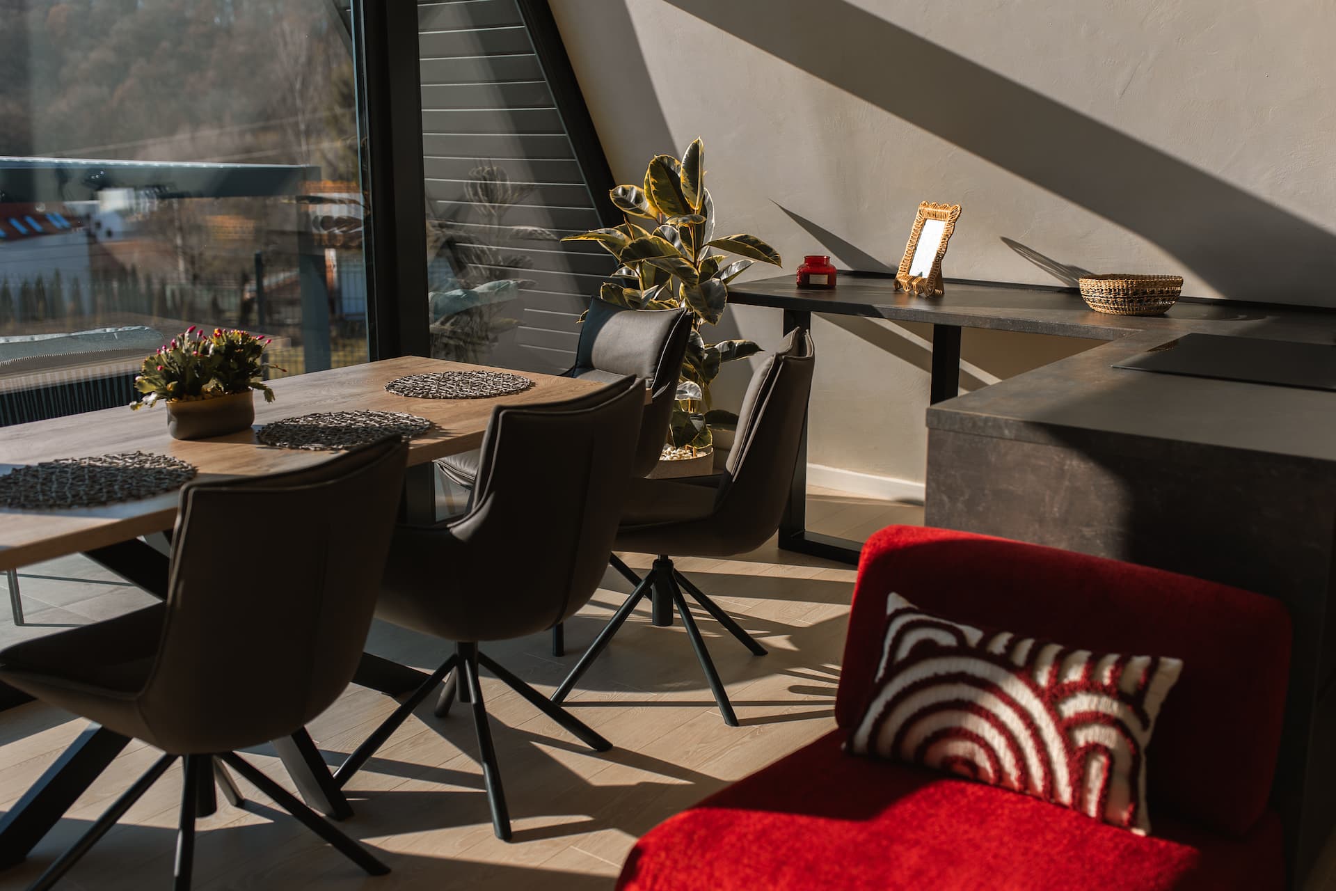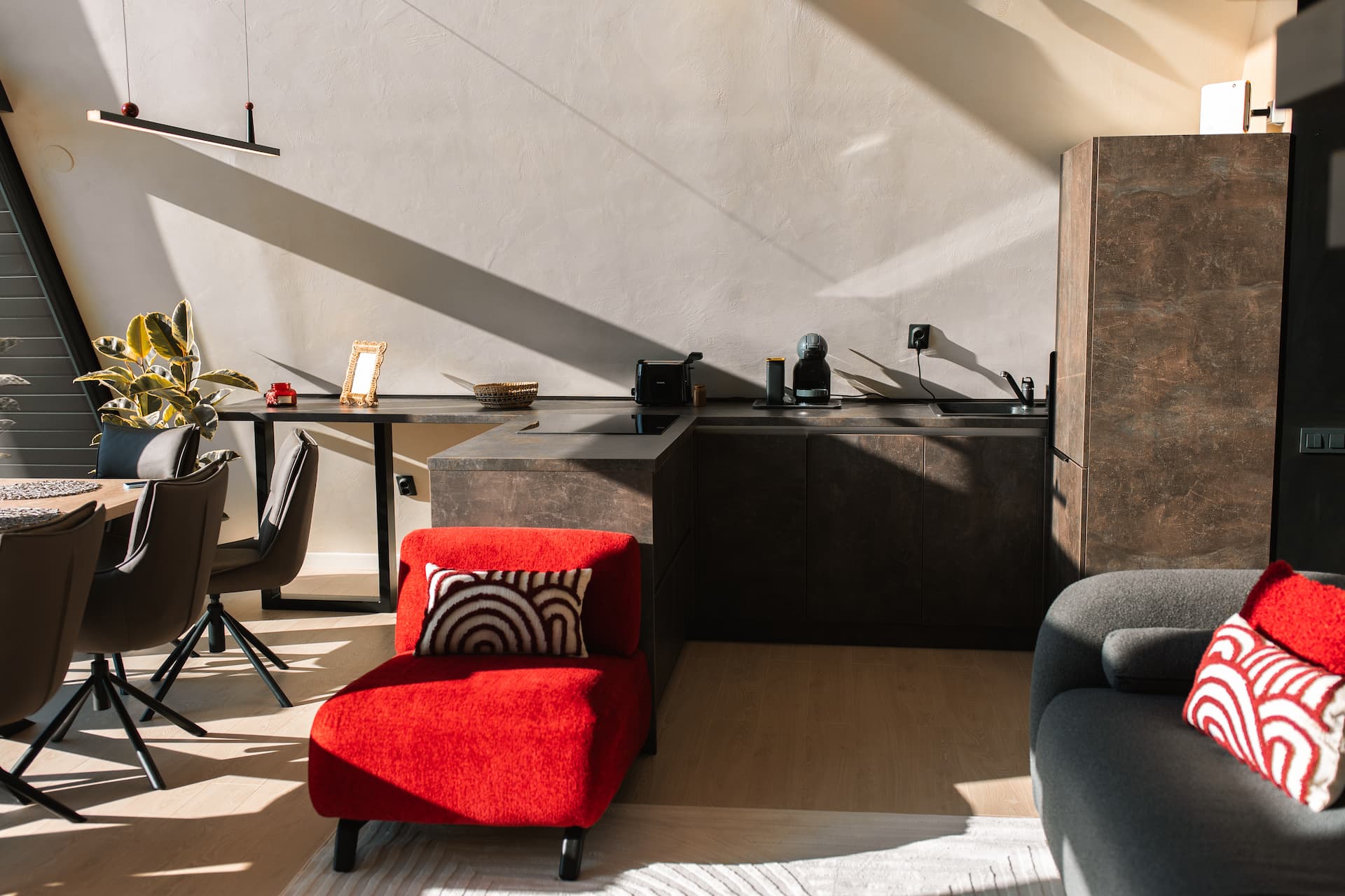 Cele două cabane Twin Vista dezvăluie două atmosfere distincte, create cu grijă pentru a oferi o experiență rafinată. Livingul în nuanțe de roșu îmbină accente elegante cu o lumină caldă, transformând fiecare moment într-o invitație la relaxare profundă. Este spațiul ideal pentru seri liniștite, lectură sau un pahar de vin savurat în intimitate.